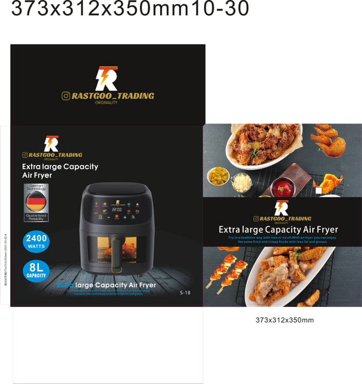 S18Gسرخکن بدون روغن،دارای طرح ویندوز،لمسی،درب شیشه ای،۲۴۰۰وات،۸لیتر،رنگ مشکی،دارای تنوع پخت و چندین برنامه،قابلیت تنظیم دما و زمان در حین پخت،دارای فن گردش هوا